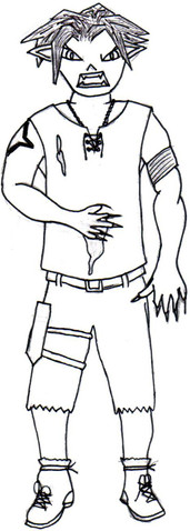 Jared is just over 1.72 meters (5' 9") tall and weighs 65.77 kg (145 lbs). He has a muscular build and his hands and skin are rough from working outdoors helping his grandfather in the scrap yard. He has blue eyes and blue hair. His skin colour is slightly darker than Caucasian and is indicative of his Mexican origins. He also has a single gold ring in each ear.