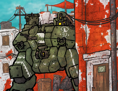 Beautiful work! Such fine, pixely details! You know what really impresses me though? That a hastily constructed cinderblock shack in the slums can support the weight of a massive armored war machine!