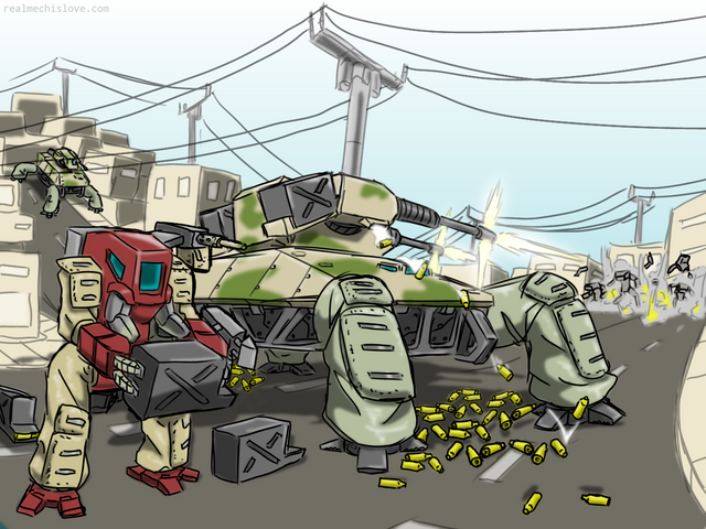 At first I thought this was urban warfare between militaries, but if it WAS and that tank/walker was there standing guard, a soldier could easily try and sneak into the basement of the building, blow the foundations and let the machine fall.