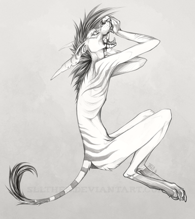 A quick (hour or so) doodle of a Langurhali guy I had a sort-of dream about. More like, he appeared for a split second during a big dream about being in Willora and just spending the day there, watching the Langurhali work and clean and cook and build. There was a little circle of Langurhali off to the right of the forest that I walked by, all surrounding this severely broken, frail, purple-ish Langurhali male. He was an adult, rather tall, but very thin like he'd spent years in the Forgotten Forest and suffered all kinds of ailments and fought all kinds of creatures there. There was a younger female who looked just like him, hugging him and crying, perhaps a little sister... not sure but I just had to get this guy sketched out before he left my memory. Not sure of a name yet.
