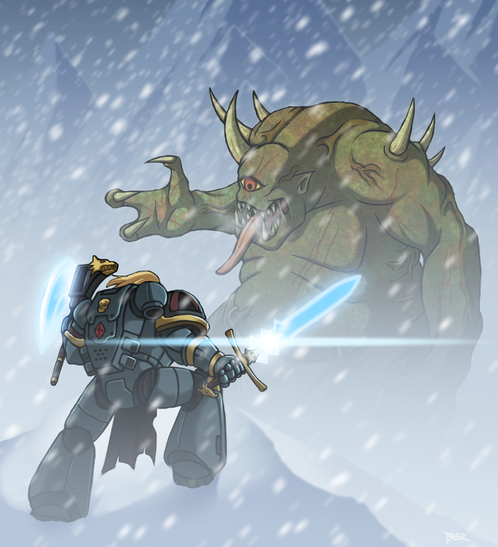 This guy needs to learn to take better care of his armor! I mean I know you can't stop in the middle of dealing out swift death to make sure you're looking your best, but my goodness... Like the silhouette in the background. Sets a nice context for the big guy to do his thing.