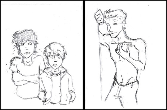 These were some preliminary scans I took to show a friend. I worked on them some more, especially in the way of fixing Todd's face, but then I lost my sketchbook. SMART. So I'm just uploading the unfinished sketches instead. DERP A HERP A DERP