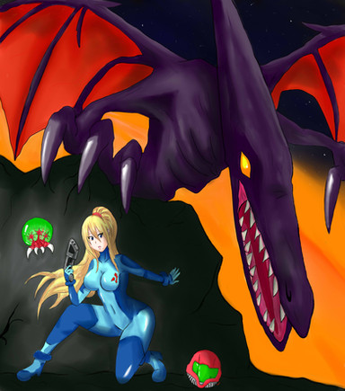 Ridley: 'rips her helmet off' Ahhhhhh... such a shame.... you look JUST like your mother... Before i 'warmed up to her' Heh... Samus: You'll look like Zebes WHEN I'M DONE WITH YOU... MONSTER... 'blasts plasma in his eyes' Ridley: 'shrieks' YOU WRETCHED COLONY DOG.... EVEN IF I CANNOT SEE I CAN SMELL YOUR FEAR... 'claws at the wall' WHERE... ARE YOU... 'roar' Samus: 'fires again' Ridley: 'slashes in an arc'