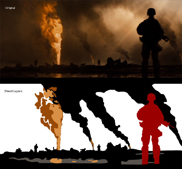 A shot turned to stencil from the movie Jarhead.The layers used [link]
