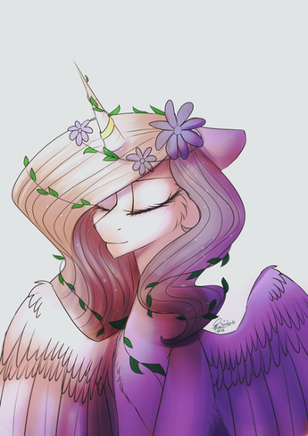 I very much like this representation of the Lauren Faust Alicorn OC you've drawn. It has a very interesting feel to it, with her pose and expression give a sense of serenity, or perhaps something I can't quite put my finger on. The details of her figure, like the shading on the underside of her wings, and the contrasting points of symmetry and asymmetry enhance the piece's beauty. All the small detail on her flowery crown is quite impressive, as well.