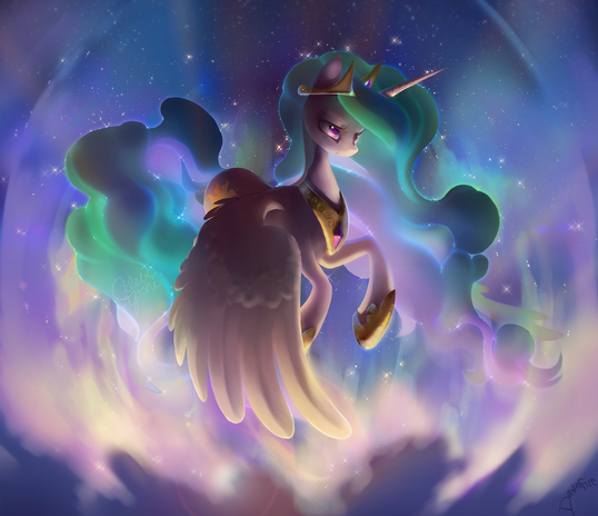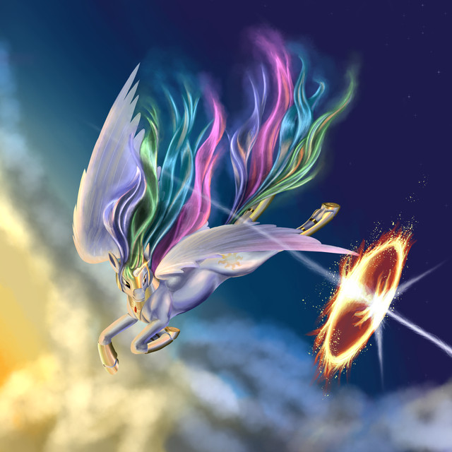 I'm not able to give critiques but I would just like to say a few things about this. For one, I have to say that the companion piece was amazing, and this makes it all the better! I gotta say my favorite part is the wings, like, OH MY GOSH! The texture and lighting and edges of the wings is just the best! The elements among the clouds is also just.. I love the lighting, especially compared to the companion picture of Luna!!!