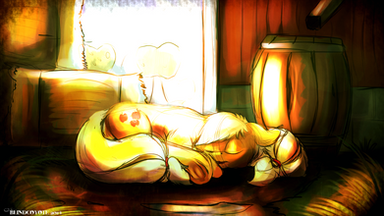 The first thing that strikes me is the slight gender bending of Applejack. Detecting a more masculine vibe to her form. It reminds me of the successes of the equal marriage law passes in countries so far. It can be difficult to come to terms with who you are and that goes for everypony. The technique displayed here is expressive and abstract like the artist suggests. Slightly surreal with a thought provoking attitude to the piece. BlindCoyote is one of those drawers / painters that are not afraid to express the inexpressible. Well done mate. A truly intriguing work of art /)