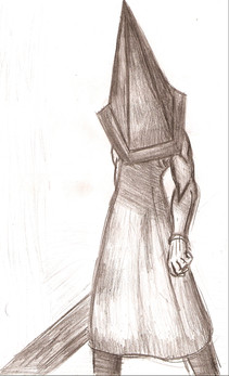 I drew this at school, a day after watching Silent Hill for the first time. I always knew Pyramid Head was hot, but when I saw him rip off Anna's skin and throw her extracted hide against the church doors I knew I wanted to marry him. I don't know why he looked so good in that scene with his hand outstretched towards the doors, but it made me melt in my seat.If you didn't know, Pyramid Head is from the horror game Silent Hill, and he is yummy.