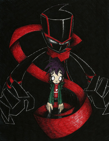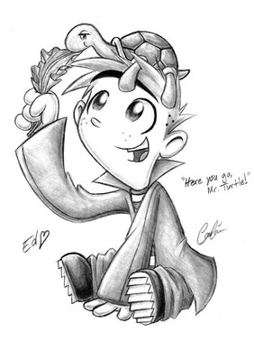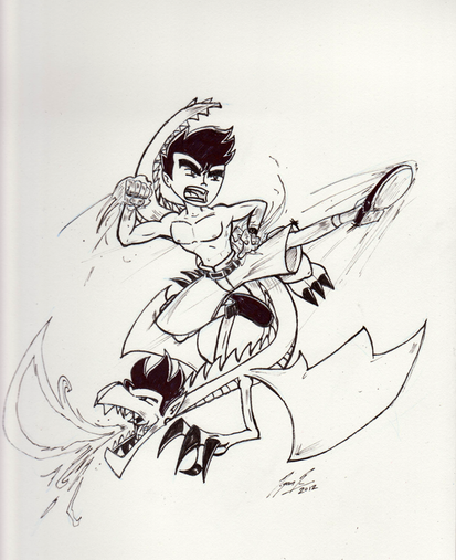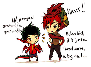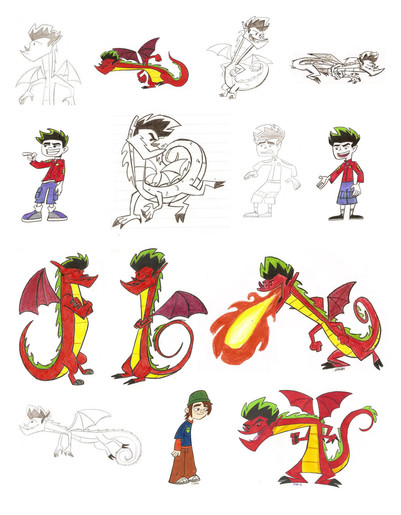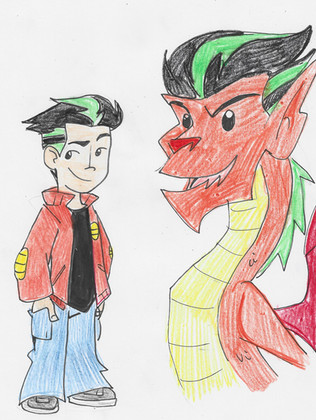 Randy meets Nitro!Nitro's a little dragon that I made up forever ago. A little dragon with an explosively big ego. He always thought he was the coolest thing around and felt he was above everyone else, until he came across that 9th grade kid. A major surprise was in store for the mini dragon when a super excited Randy ran up to him. Nitro's first thought, "MAN that thing's HUGE! 8C ".