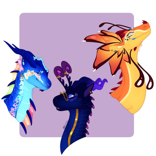three character flat chibi comm for PhoenixTheAnimus featuring their characters quasar, dranix, and phoenix!this certainly was one beast of a commission to finish haha