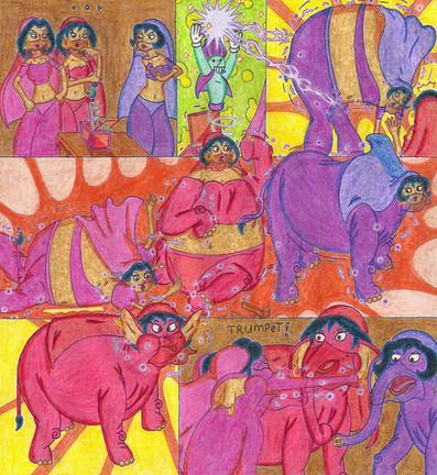 A TF comic Sequence of Gadget HackWrench in a parody of the desert scene of "Pink Elephants on Parade".