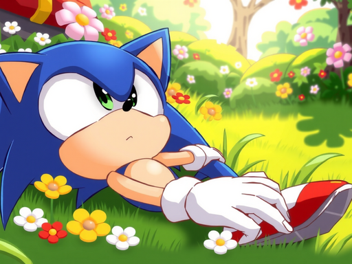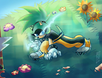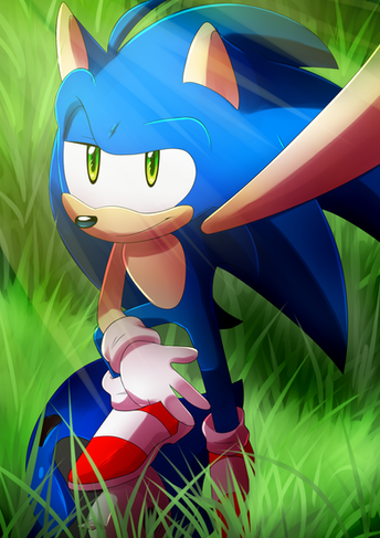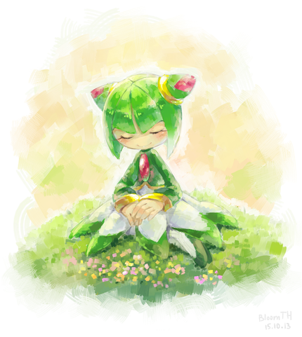 You have a very attractive painting technique, BloomTH. The soft brush strokes and vivid hues of blue and green make the foliage look quite vivid and natural. The flowers, while only a smattering of strokes, enrich the background in an abstract way. Sadly, your character strikes me as yet another one of the hundreds of Sonic rip-offs that plague the fandom. The last one I saw was Splash the sea urchin who belonged to Drawloverlala. After I criticized the derivative look, she redesigned him to better effect. Perhaps you could do the same here.