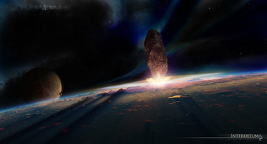 Edit (9 Apr 2010): Some little tweaks here and there. Most importantly, the transition between the rocks at the bottom (which, themselves, have been brightened up subtlely on the left) and the corresponding atmosphere above has been improved. Furthermore, a little change at the impact-place, adding a small flare to it. Hope you like it