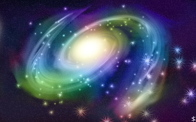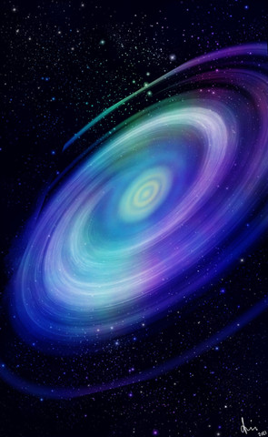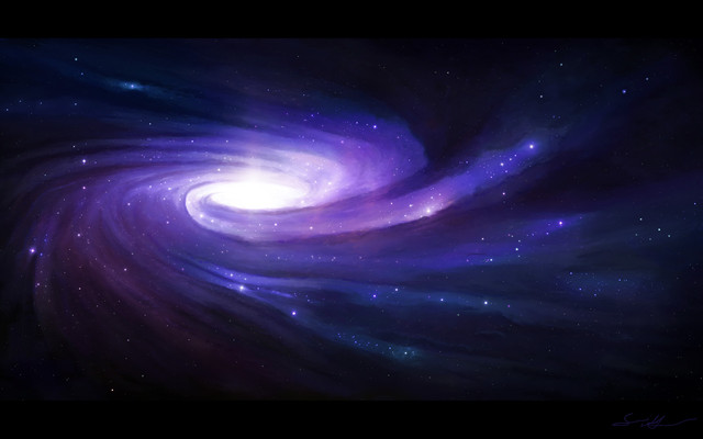 I feel strangely attracted (heh) to images of galaxies, black holes, and any combination of them (click and click ) so it felt kind of like a must to go into this direction one day or the other again. When I read about the Nature Wallpaper Contest , this felt like the perfect opportunity to paint one of the largest natural objects known to mankind (excluding these dreaded superclusters for the sake of getting my point across ). In the end, it kind of turned out like a hybrid between a nebula and a galaxy...