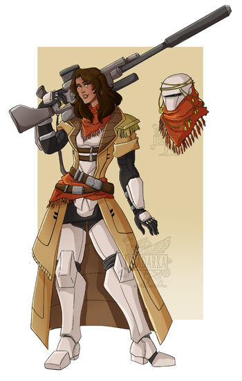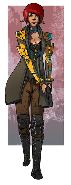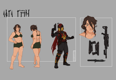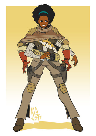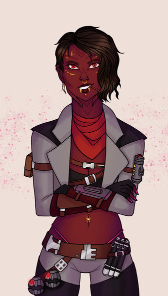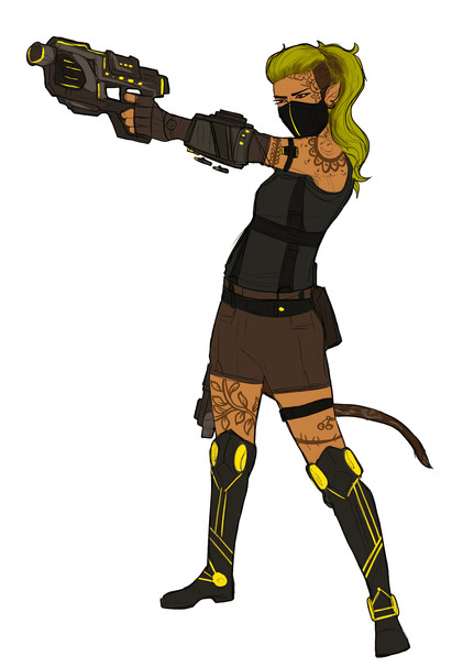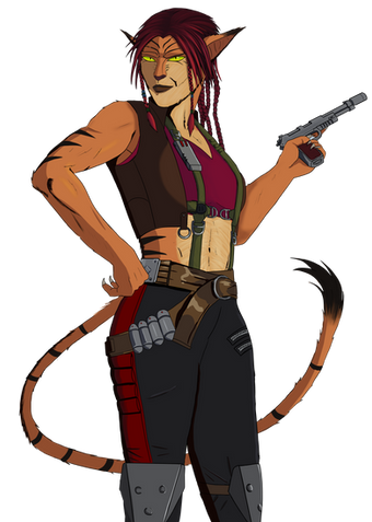 Tug is a bounty hunter/ bodyguard that works under the gang leader, Rhodo Croseit . She specializes in many forms of weaponry. She's quiet most of the time without speaking much besides to her leader, who she is incredibly loyal to.