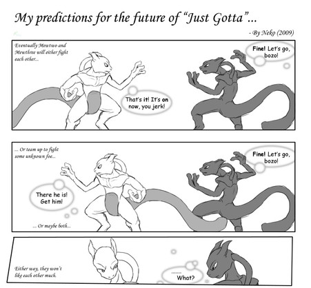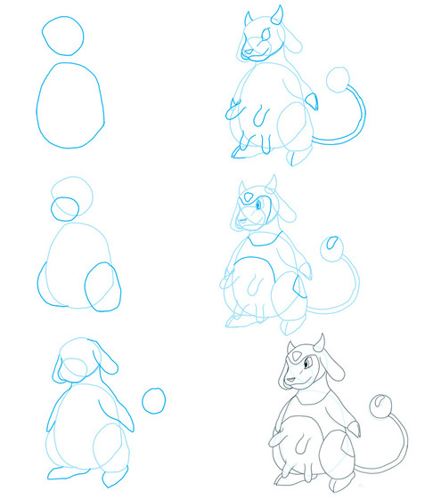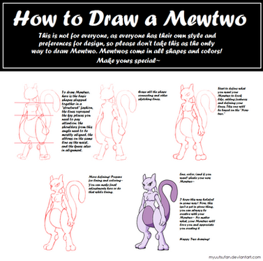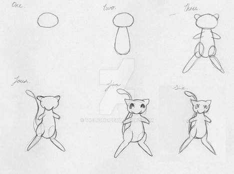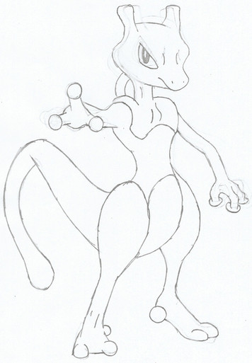 Aaah... Mewtwo, the cloned, mutated cat... thing... This PokΓ©mon is pretty hard to draw, and I'm not really happy with this step-by-step picture, but I guess it'll have to do. As always, start by drawing a large oval and a small circle. These will become Mewtwo's belly and head. Connect the head and the body with a smooth, curving line. Coming out of the body, the line should continue until it's about twice as long as the body. Now draw a v-shape underneath the body. This will help you determine where to place Mewtwo's feet. If it is too hard for you to determine the correct location of Mewtwo's feet, try drawing a floating Mewtwo instead.