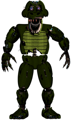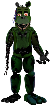 Five Nights At Freddy's Belongs To Scott Cawthon ; (C) Scott Cawthon 2014-2022This Does NOT Fall Under Free Use, You Are NOT Allowed To Use This In Edits ; (C) BlueBearStudios07 2022-2022WOW! I haven't had to put this much work in since the hoaxes! And it's a good thing I put so much work into him, because he turned out great! I must say, the creator of this OC knew what they were doing the entire time while creating it. They easily captured Scott's style so much and I wanted to do the same thing, and I did. This could honestly fool someone as a cannon character, there's hardly a bit of copy-pasting leftover after the editing, they have an original head shape, torso shape, creative withering, and, like every other withered animatronic, it's missing a body part.