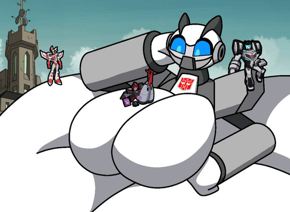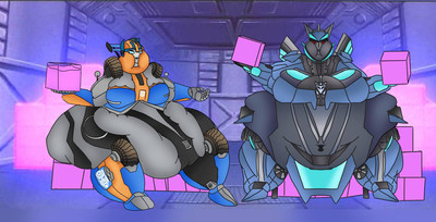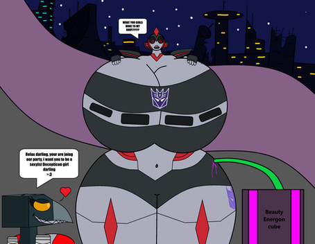 sequel to yesterday's imageshockwave seemed to have forgotten the decpeticons also have fembots when he used the enlargement ray on Elita 1's group. Now a pair of massive fembot decepticons confront shockwave