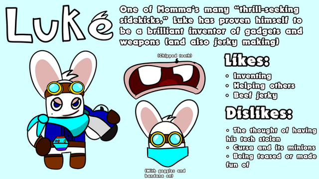 Welp, I now have a Rabbid oc… let me introduce him! (Also, you’ll probably not understand this if you have not played Mario + Rabbids, Sparks of Hope)Meet Luke, one of Momma’s many "thrill-seeking sidekicks" in Barrendale Mesa, and one of the most intelligent at that, going as far as to make his own machinery and equipment during his free-time, such as a working Electro-Cannon (the thingamajig on his back) and even managing to create his own portal technology in the form of throwable bombs that release a portal from where they were thrown to where they landed. But when Cursa‘s minions arrived on the planet, he knew that if they were to get their hands on his tech, everyone on Barrendale Mesa and maybe even the entire universe might be doomed, and so he secretly hid away in an unknown location.