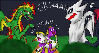 "W-Who's there...?"-ScalerVolt again, this time he's going after Scaler. I liked how this one turned out. I didn't add a background in, though. They're supposed to be in a jungle-like area and Volt's supposed to be standing on a rock.