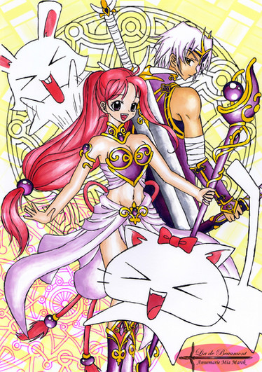 Tomboy teenager Sari Shidou, along with her friends Buuni Houjii and Umi-Su Ryuzaki, are summoned once again to the magical world of Cefiro, not long after their defeat of Princess Roseraude. There Sari meets Sonniku, nephew of High Priest Chukato, and master magical swordsman. In time she falls in love with the quiet swordsman. Primamy the fairy's best jealous efforts to keep them apart are thrawted by the seemingly innocent actions of the ever cheerful Milekona.Heh, my under-the-wire entry for 's alternate universe contest. I went with Rayearth, which was kinda fun. Earth=Mobius hahaha... I went kinda quick on this so the background suuuucks.