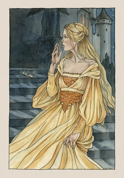 This is amazing! Reminds me of the Golden Age of illustrators- I really thought it was a scan of a vintage piece until I saw the step-by-step link! I am in love with all of this; the dress almost matches the way I see it when I read the story. Wow to nth degree