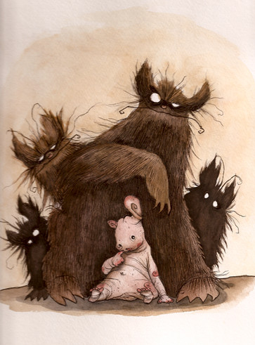 This kind of reminds me of the movie "Spirited Away". Young girl among strange things in a strange place. I'd want to hold my stuffie tight too if I was alone like that.
