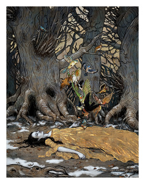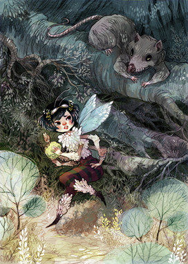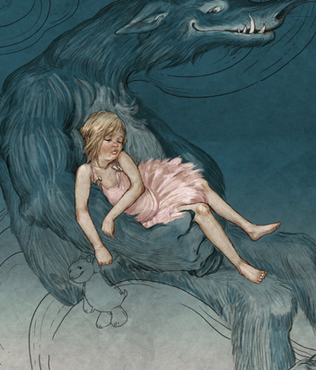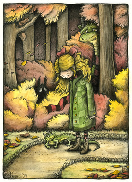 Beautiful depiction of childhood fears... the part that really catches my eye is the forest itself, with the marvelously executed creatures and shadows, and the dappled pinks of her cheeks and the shading on her yellow pants. It is interesting that she does not really look scared... sort of, suprised and anticipating? It is like the picture should be frightening, but since she isn't afraid, it is simply whimsical. Very nice.