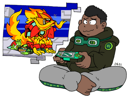 A junior member of the Crack Team that specializes in paintball like Gundramon Rookie. He is a shy subspecies of Kotemon that absorbed fire arm data and mutated into this form. The paint ball bomb earring is a gift from Bellestarmon Rookie, who saw through his shyness and saw the gun toting maniac within, which boosts his confidence. Otherwise, he is a reliable foot soldier who doesn't talk much.