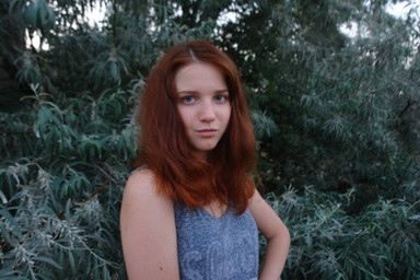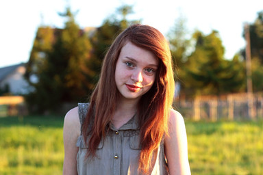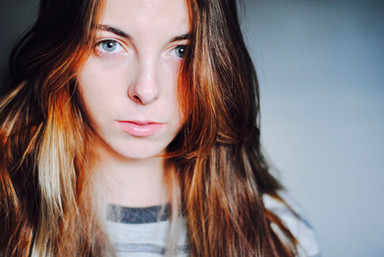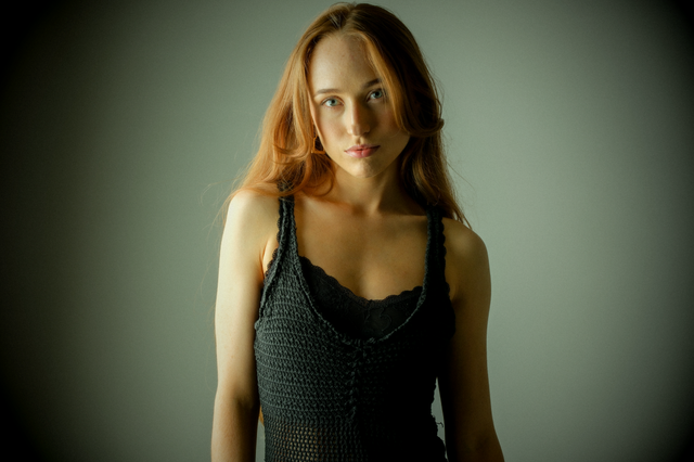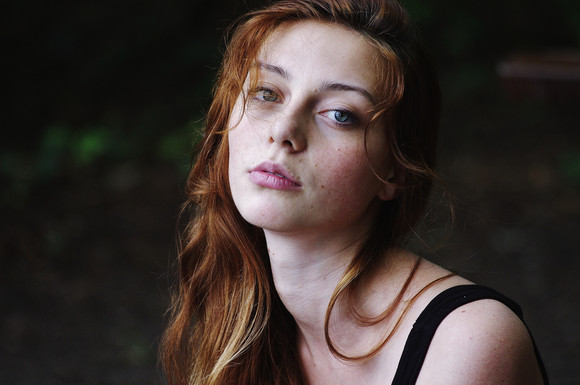 Wonderful atmosphere in this self portrait; the emotionless stare, the shallow depth of field. Β Very pretty. Β Love your hair color.