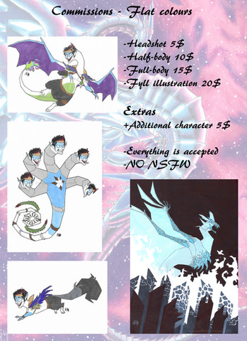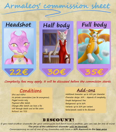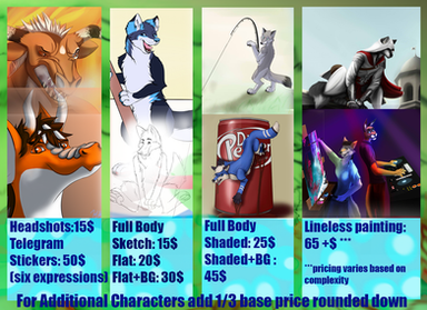 yeah, I decided I seriously need to make a more up to date commission info sheet. I added more recent pic examples, changed the prices a bit, but not by much and added the option for more detailed and painterly done artwork.same prices apply to all forms of artwork, whether anthro or feral or fantasy.
