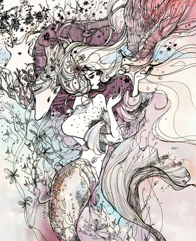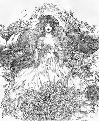 I love the soft and bold lines. I also like how you focus the detail on the girls hair with the flowers in her hair and the floral vines coming in the background. Gives that Art Noveau feeling