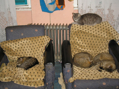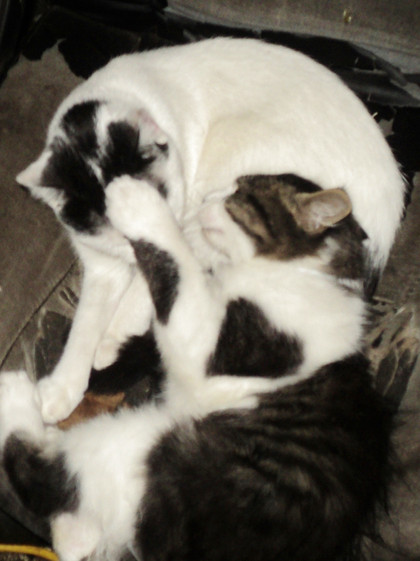 WAAAAAAIII!!! Kawaii neko da!!! The black cat to the right looks almost like my Chacha. Do you have anymore pics of your cute kitties? CAT FIGHT!