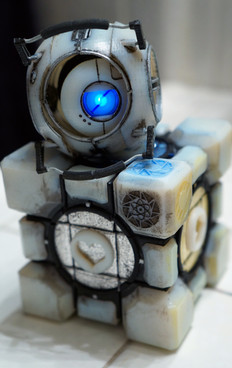 The model is what I consider to be a life-sized Wheatley, measuring about the size of a Basketball. It is moderately poseable: the eye can slightly look in different directions and there are several different shaped eyelids/shutters to pose different expressions. The handles also move slightly, but he ended up a chunky little robot and they can't get over the width of his chassis. The light behind the optic works but is still considered in-progress, due for some changes.