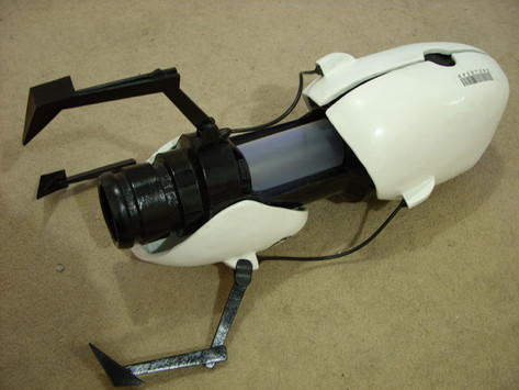 The model is what I consider to be a life-sized Wheatley, measuring about the size of a Basketball. It is moderately poseable: the eye can slightly look in different directions and there are several different shaped eyelids/shutters to pose different expressions. The handles also move slightly, but he ended up a chunky little robot and they can't get over the width of his chassis. The light behind the optic works but is still considered in-progress, due for some changes.