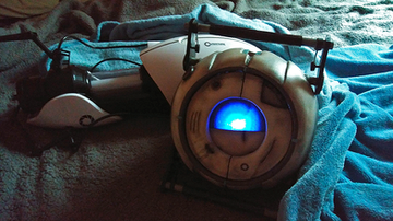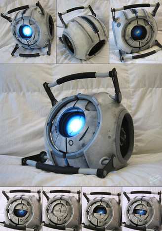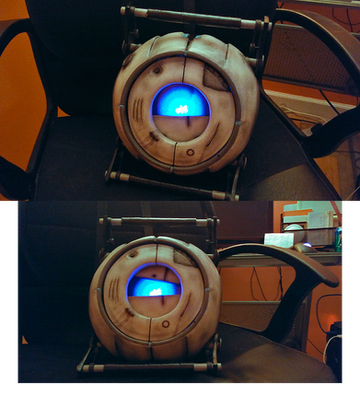 The model is what I consider to be a life-sized Wheatley, measuring about the size of a Basketball. It is moderately poseable: the eye can slightly look in different directions and there are several different shaped eyelids/shutters to pose different expressions. The handles also move slightly, but he ended up a chunky little robot and they can't get over the width of his chassis. The light behind the optic works but is still considered in-progress, due for some changes.