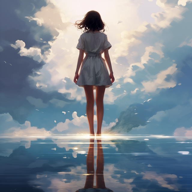 #anime #sky #wallpaper #sea #reflection #beauty #ai #atmospheric #beams #birds #blue #clouds #dress #estuary #horizon #light #ocean #poetic #river #sunset