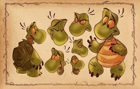 I love the design elements in this guy, and the draftsmanship of the sketches is beautiful. He does look quite a bit like the turtle from Over the Hedge, though.