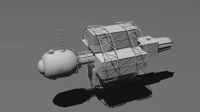 Progressing on building the bulk space freighter for "The Gentle Wolf" web comic. This is roughly what it would look like sans cargo. Lots of work yet to do. Visible in this view at the far back are the Thermal Control System radiator panels. To give you an idea of size the TCS panel assemblies are each right at 130ft long.Read the web comic here: thegentlewolf.net/