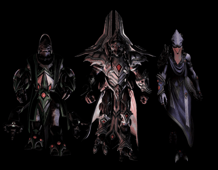 Early screenshots of the Dark Templar models, with the older Zealot and Dark Templar model for comparison. This was at the point in development when we were listening to fan feedback concerning the Dark Templar's redesign, and moving forward with exploring having two versions of the same unit.