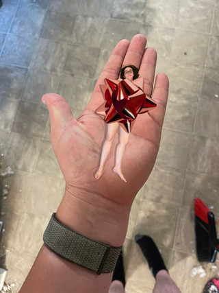 “I’m down here!” Lisa yelled at her Mom.Her Mom was a bit disappointed Lisa didn’t return home to bake holiday cookies as she promised, but she understood being an adult brought lots of conflicting responsibilities. So she didn’t realize Lisa was not only home, but that she had shrunken and fallen into the non-pareils dish. As her hand tilted back, Lisa clawed as best she could to stay as falling onto that cookie sheet surely meant her demise…