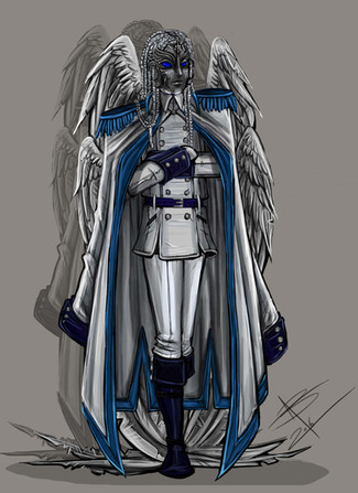 that's a fave. awesome design. The wings look so awesome, I love your coloring and shading, and the Axe looks awesome. Good job on his uniform. I really think the torn up cape is very nicely done.