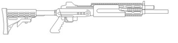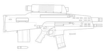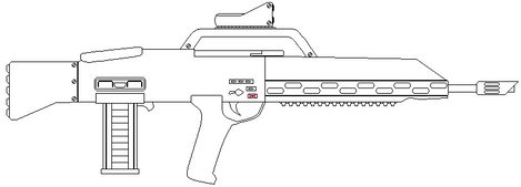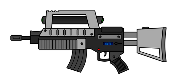 The second of the Redemption concept pieces, an assault rifle with an over/under grenade launcher. I think it's a bit uglier than the magnum, but that's just me.A mad AI once described the original Marathon assault rifle as a "ridiculous toy designed to impress aging pompous generals." Of course, the replacement he designed was little better. I've tried to preserve the simple, mass-produced look of the original while basing the new design on real-world trends.