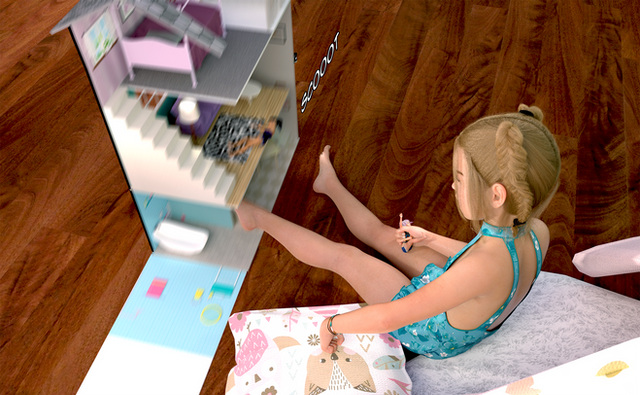 I wanted this one because I've enjoyed your previous sets where you had a girl dress up Val. Glad we didn't have her mess up that pretty hair, though. By the way, I like the way you use the background to differentiate between the two girls' bedrooms. Very nicely done.