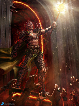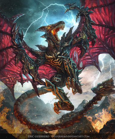 This is awesome! What a terrifying looking dragon! I love the exposed muscle of bone and how the fire is burning inside is showing through his rib cage. Also, interesting wings as well! I think that use a more feathered look for his wings give him a very "fallen angel" type look. Fantastic work!