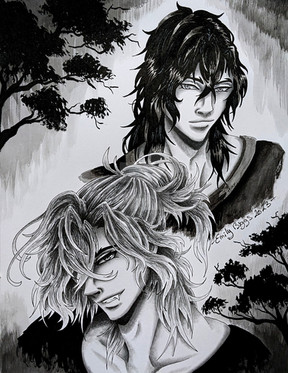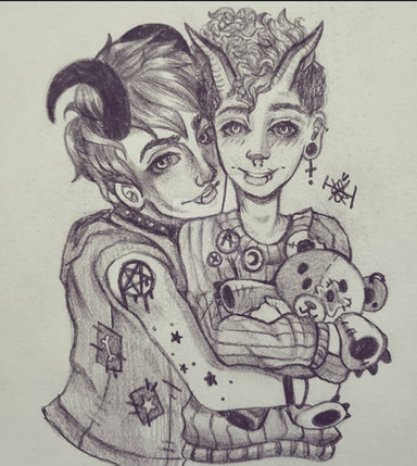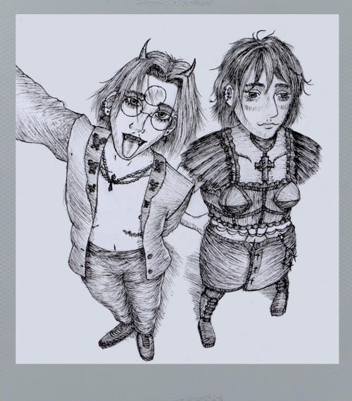 Commissions open on Etsy:Β www.etsy.com/shop/BoggleBeamArβ¦Graphite drawing, Fortnite AU fan art of Sanctum and Midsummer Midas.