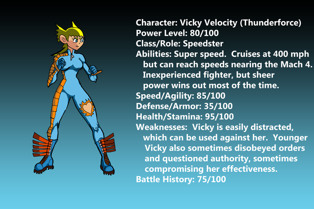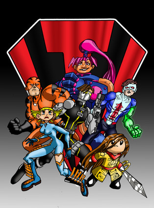 it's sort of a second try at getting characters right. i tried to have the characters more like they should be in this pic. when i drew fisticuff before, i assumed she was HUGE so i drew her as the brick. after seeing her standing next to agent 42x in her intro comic, i realized how short she is! so i drew her the correct size. i have cross a bit happier since he sees Thunder Force as a new beginning for him. i drew vicky flirting with wireless and the suit and schoolgirl flirting or interracting in some way, too.