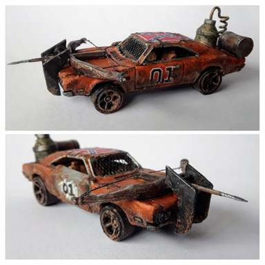 I'm still having fun making cars for Gaslands and I decided that each vehicle needed it's own post so I could revel in it's tiny glory. Photographing tiny cars, it turns out, is an art of it's own and one I'm not terribly skilled at. Getting the lighting right for good color is really tough! But I tried my best.This is Lightwing. The driver, Mads Rhode, along with his girlfriend, Em, make up Team Stormageddon. They're both younger drivers and don't full understand what they're in for. They treat the whole blood-sport thing like an elaborate joke. But they have talent and a passion for going fast!