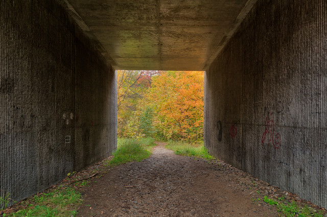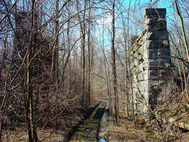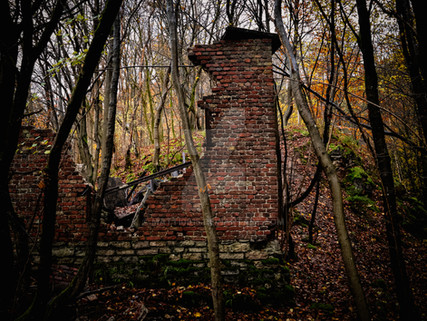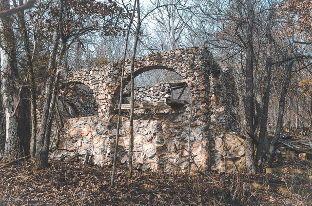 Support me on PatreonWooded autumn scene featuring ruins of a lone standing wall once part of the Bluestone Quarry located near Dunbar, Pennsylvania (USA).