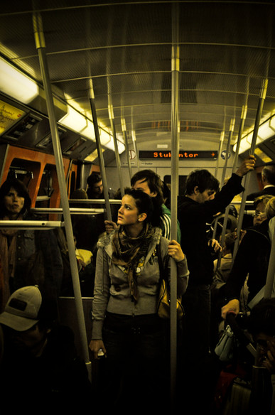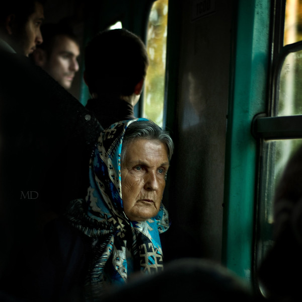 there is a solemn feeling/aura in this picture; that man in the foreground with his head bowed low, the woman with her eyes closed in a sad poise, the rest of the passengers with their backs towards us.
